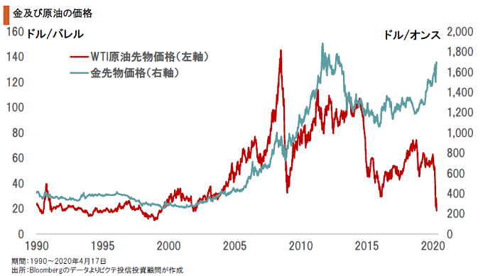 新型コロナウイルスが世界経済の脅威となるなか、金の価格が堅調だ。代表的な商品市況としては、原油と対照的な動きになっている。一般に金はインフレに強い資産だ。足下、世界経済は失速しつつあり、デフレ的な圧力が強まっている。名目金利の低下は利息のつかない金には追い風だが、現在の経済環境と金の市況は説明の難しい状況と言えるだろう。もっとも、長期的に考えれば、この新型コロナウイルス問題こそが、金が買われる最大の要因なのではないか。FRBをはじめとして主要中央銀行は、信用不安緩和のため大量の流動性を供給している。新型ウイルスが収束し、経済が正常化する過程において、この流動性を摩擦なく回収するのは極めて難しいだろう。バランスが崩れれば、通貨価値の下落、言い換えればインフレを引き起こす可能性は否定できない。また、日米を中心とした財政出動も、国債の大量発行を通じて通貨価値に影響する見込みだ。当面はデフレ圧力が強まっても、長期的にはインフレになる・・・このシナリオが、金への投資を促す強い動機付けになっていると考えられる。