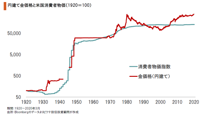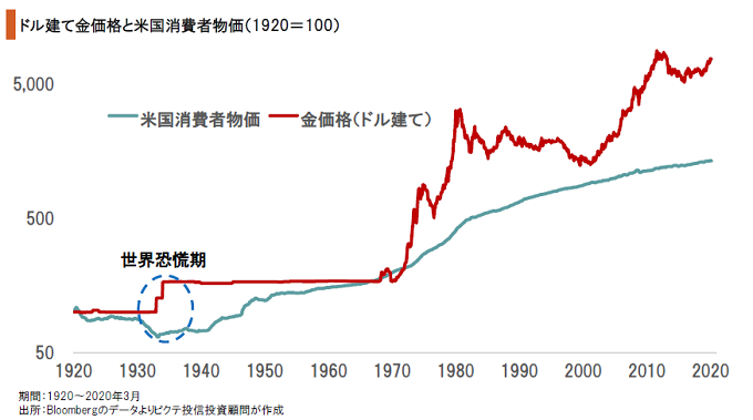 過去100年間に渡り、金は米国において非常に有効なインフレヘッジの手段だった。また、1929年秋に始まった世界恐慌の際には、米国を含む主要国が金本位制を離脱したことで、強烈なデフレ局面だったにも関わらず、金の価格は対ドルで大幅に上昇している。つまり、金は経済・社会の劇的な変化に極めて強い資産と言えるだろう。