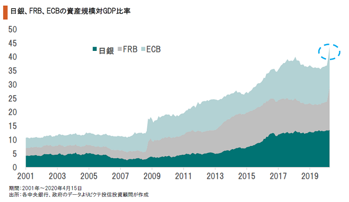 FRBのみならず、日銀、ECBも量的緩和を強化せざるを得ない状況にある。これら3大中央銀行の資産規模は、対GDP比で過去最大の規模に膨らんだ。新型ウイルス収束後、各通貨間での実質的な切り下げ競争、そして主要通貨の実体経済に対する切り下げ・・・この両方が起こる可能性は否定できない。そのリスクヘッジとして選好されているのが金なのではないか。