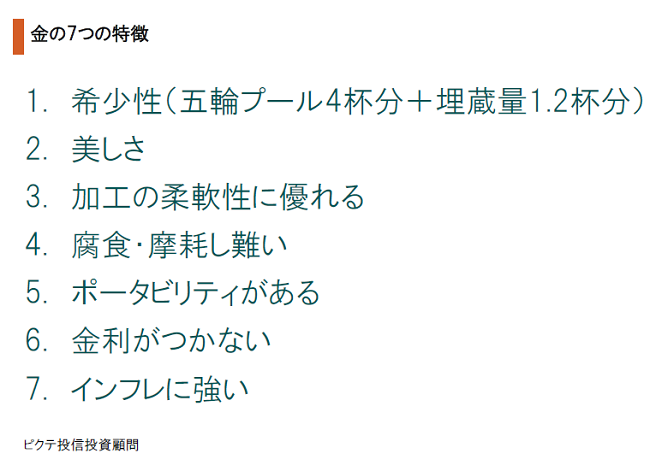金には希少性、美しさ、加工の柔軟性、耐久性、ポータビリティ・・・などの特性から、古代より装飾品、貨幣として活用されてきた。また、近代の貨幣制度の下、本源的に価値を持つ通貨として、兌換紙幣の信用力を裏付けたのである。戦後、現代通貨制度、即ち変動相場制に移行、通貨としての特殊な役割は失ったが、引き続きインフレに強い価値貯蔵手段である。