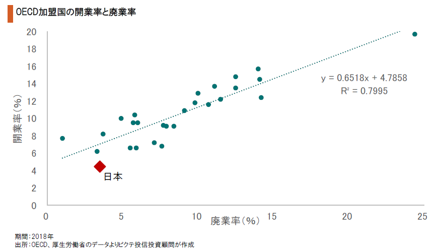 OECD加盟国の開業率と廃業率の関係を見ると、非常に強い正の相関関係が統計的に示される。つまり、開業率を上げるには、廃業率を高めなければならない。それは、産業の新陳代謝の下、限られた人材や資本が成長産業にシフトする必要があるからだろう。日本の場合、企業の持続性が政策的に重視されるため、ベンチャーへの資源シフトが進まないのではないか。