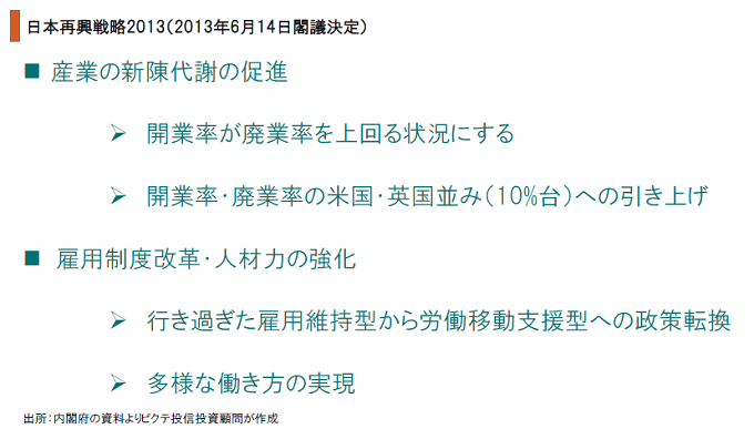 第2次安倍政権が発足して最初の成長戦略となった『日本再興戦略2013』(2013年6月14日閣議決定)では、開業率・廃業率を米英並の10%台へ引き上げること、行き過ぎた雇用維持型から労働移動支援型への雇用政策の転換が謳われていた。これは、ベンチャーの育ち易い環境を整え、成長産業への人材のシフトを促すことに主眼があったと見られる。