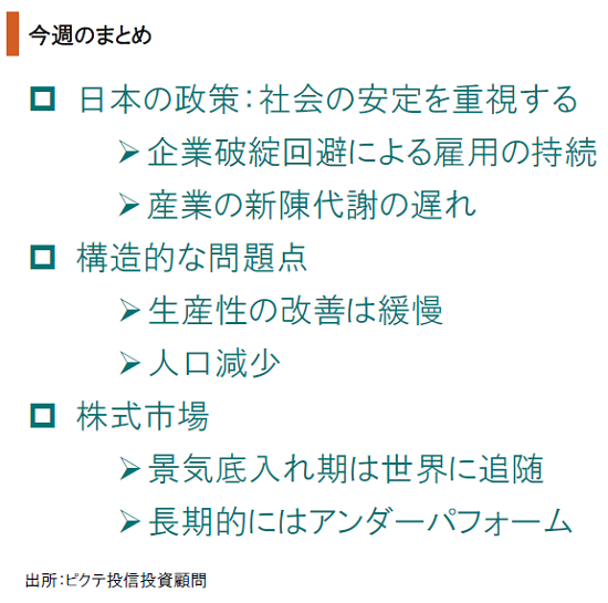 新型コロナウイルスによる経済失速下において、安倍政権がセーフティネットとして大型の財政政策を実施しているのは適切と言える。もっとも、その中身は依然として産業構造の固守に重点を置き、産業の新陳代謝を図るものにはなっていない。これは、景気底入れを容易にし、社会の安定維持に貢献する一方で、中長期的には生産性の改善をさらに難しくするだろう。この政策の下において、日本株の持続的なアウトパフォームは期待し難くい。