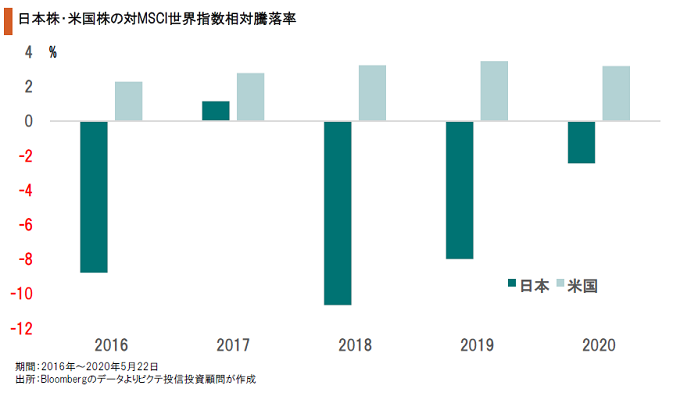 過去4年半、日本株が世界市場のパフォーマンスを上回ったのは2017年のみだ。一方、米国株のアウトパフォームが続いてきたのは、高い開業率、廃業率に象徴されるように産業の新陳代謝を進め、高い生産性を維持してきたからだろう。日本の場合、企業の存続による雇用の維持を重視してきた結果、生産性が伸びず、株価も相対的に低迷している。