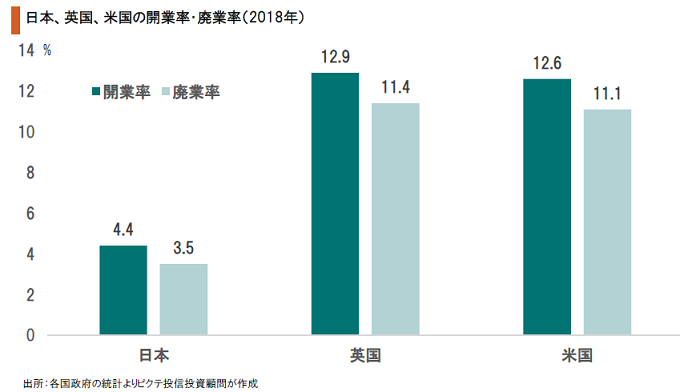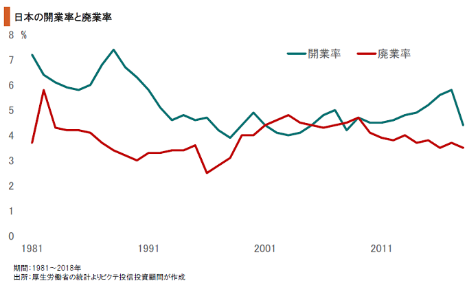 2018年の開業率及び廃業率を見ると、英国、米国は共に10%台だった。一方、日本の場合、開業率は4.4%、廃業率は3.5%であり、日本再興戦略2013が目指した水準には全く到達していない。景気が堅調に推移するなかで、第2次安倍政権発足当初の経済に対する危機感が薄れ、政治的に抵抗の少ない現状維持型の政策が選択されてきた結果ではないか。