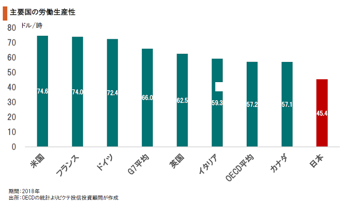 G7各国の労働生産性を比較すると、最も高い米国を100とした場合、日本は60.9に過ぎない。G7平均との比較でも68.8だ。日本の生産性の低さの背景は、長時間労働やサービス産業の効率の低さ、そして経済を牽引する成長産業の生まれ難いことが主な理由と考えられる。強いベンチャーが続出しなければ、生産性の持続的な改善は難しいだろう。