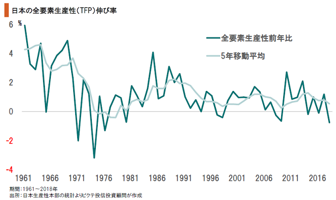 既に日本の人口は減少しつつあり、高齢化は急速に進んでいる。安倍政権下において、生産人口の減少と低生産性にも関わらず、実質経済成長率がプラスで維持されてきたのは、女性及び高齢者が職に就いたことにより、労働投入量が増えたからだろう。しかしながら、それも限界に近付いている。生産性の向上がなければ、縮小均衡に陥るはずだ。