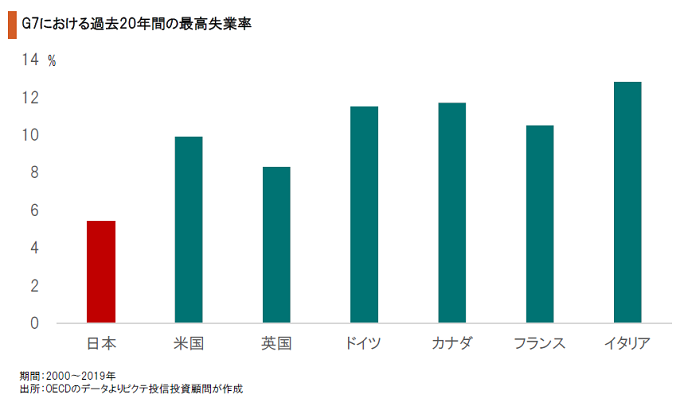 リーマンショック下の2009年、日本の実質成長率はマイナス5.4%であり、震源地の米国のマイナス2.5%を大きく下回った。一方、失業率は米国のピークが10.4%、日本は5.4%だ。また、過去20年間の最高失業率を比べると、日本はG7のなかで最も低い。これは、経済危機下における日本の政策が、企業を支え、雇用の維持を図ってきたことの傍証と言えよう。