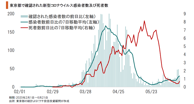 東京都は、5月上旬を底に新たに確認される感染者が漸増傾向にある。ただし、4月との大きな違いは、多くの感染者の感染ルートが確認てきていることだ。また、5月6日に2,974人に達した入院患者数は、足下、200人程度へ減少した。医療現場の安定による十分な医療サービスの供給が、死者数減少の一因ではないか。