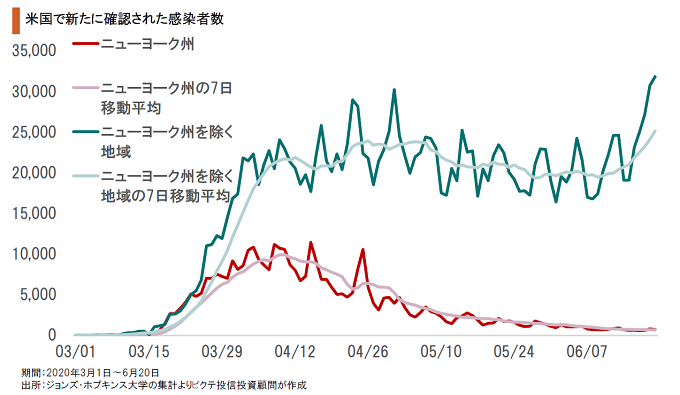 新興国・途上国と並び懸念されるのは米国の状況だ。一時は医療崩壊に陥ったニューヨークの感染は収束したものの、米国全体で見ると、新たに確認された感染者数は引き続き高水準となっている。都市封鎖が段階的に解除され、経済活動が再開しており、感染が再び拡大期に入る可能性は否定できない状況だ。