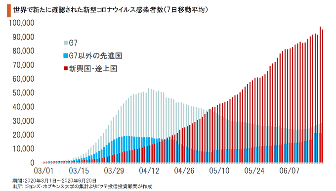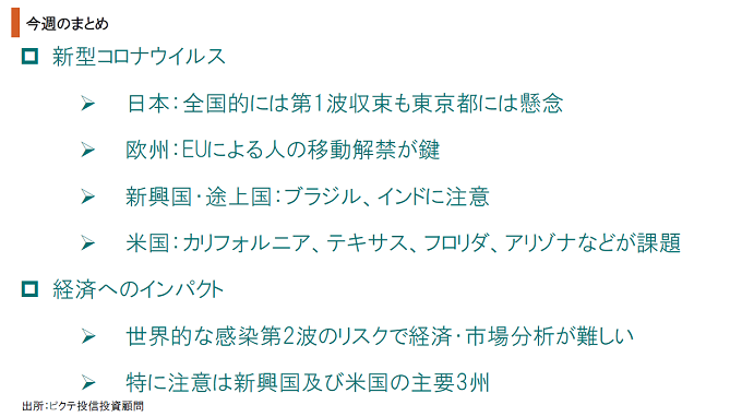 日本国内における新型コロナウイルスは、取り敢えず感染第1波が収束に向かっている模様だ。ただし、東京都において新たに確認された感染者が日々2桁に達するなど、今後、経済活動が正常化して行く過程で第2波への懸念は強い。一方、世界の感染者は増加基調が続いている。一時極めて厳しい状況にあった欧州の感染は一段落だが、国家間の人の移動解禁が及ぼす影響が注目されよう。新興国・途上国は1日10万人近い感染者が新たに確認されており、急速に新型コロナウイルスが拡大しつつある。特に懸念されるのはブラジル、インドだが、経済活動を優先する政府が適切な手を打っていないことも不安材料だ。米国については、ニューヨーク州での感染は収束しつつあるものの、カリフォルニア、テキサス、フロリダ、アリゾナなどで感染者が急増している。これらの州は経済規模が大きく、再び経済活動の厳しい制約を要する事態になれば、米国全体への打撃が大きくなる可能性は否定できない。以上、世界各地の状況を見ると、新型コロナウイルス禍は完全な収束には程遠いようだ。当面、マーケットにおいては、財政・金融政策と感染拡大の綱引きが続くだろう。