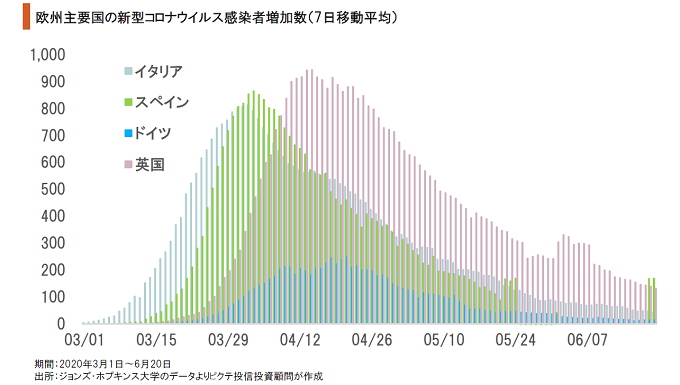 欧州において最も早く新型コロナウイルス禍が深刻化したイタリア、スペインでは、3月下旬をピークに感染は収束した。島国である英国は、4月中旬に感染のピークを迎えたが、こちらも既に落ち着いている。ただし、EU域内については、国境を越える移動の制限が段階的に緩和されつつあるため、今後はその影響が注目されよう。