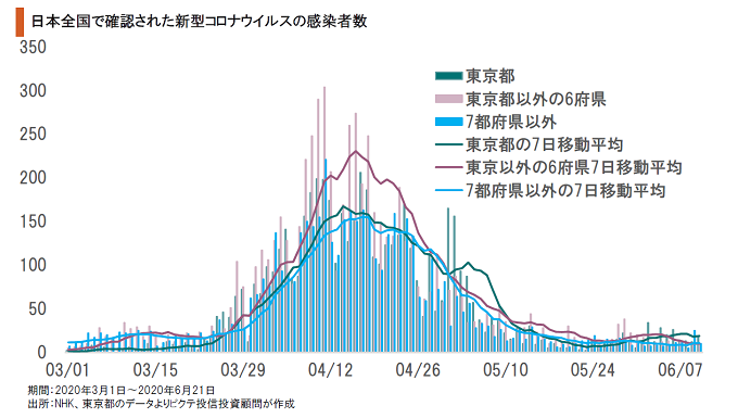 日本における新型コロナウイルスの感染は、4月中下旬がピークであり、第1波は全国的に収束しつつある。政府は、5月9日に39県、21日に関西の2府1県、そして同25日に関東の1都3県及び北海道の非常事態宣言を解除、6月19日には県境を越える移動も解禁した。これからは経済活動再開の影響を見極める局面に入る。