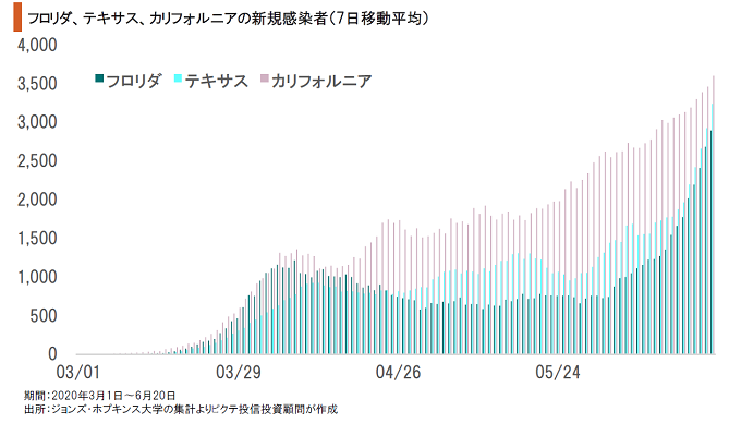 米国において特に注目されるのは、カリフォルニア、テキサス、フロリダ、アリゾナなどの南部、西部主要州である。リック・サントラム知事の下、感染第1波では逸早く州境を封鎖して感染拡大を抑止したカルフォルニアでも、新たに確認される感染者が急増している。経済活動の再開により、感染が拡大しつつある可能性は否定できない。