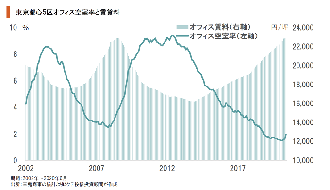 三鬼商事によれば、東京都心5区のオフィス空室率は、今年2月に1.49%まで低下した。需給の逼迫を背景に賃料も上昇を続けている。しかし、企業が仕事のやり方を見直すことで、今後、オフィス需要が大きく低下する可能性は否定できない。経営戦略の策定と家主への告知期間を考えると、その影響がデータに顕在化するのは今秋ではないか。