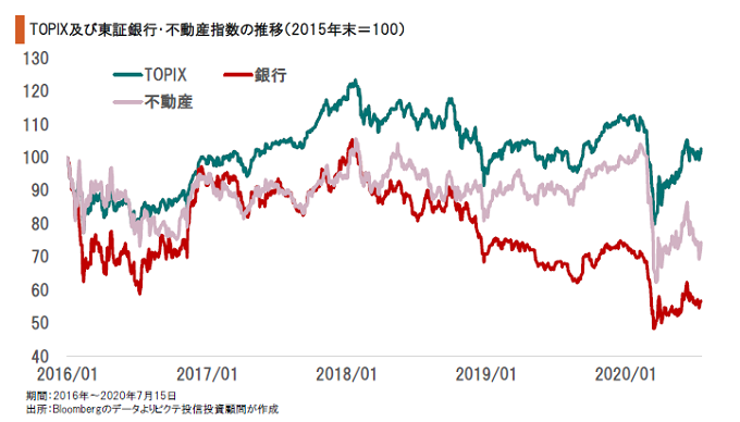 2017年以降、銀行のアンダーパフォームが目立つ。日銀のイールドカーブコントロール付き量的質的緩和により、長短金利のスプレッドが潰れ、業績が圧迫されているからだろう。加えて、新型コロナウイルス禍を受けた市場の下落及びリバウンド局面で、不動産も大きくアンダーパフォームした。これらの業種は、構造的な問題を抱えている可能性が強い。