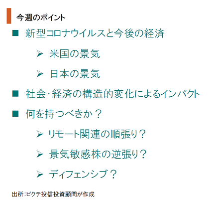 今週のポイントは、まず今後の米国及び日本の景気の見方だ。自ずと株式市場において持つべき業種・銘柄も変わるからである。また、新型コロナウイルスがもたらす社会・経済の変化に注目する必要があろう。その上で、リモート関連を追い掛けるのか、逆張りの景気敏感か、デフェンシブへの転換か、などの判断をしなければならない。
