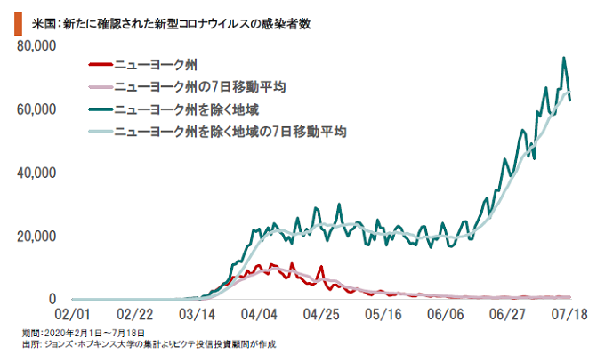 米国で新たに確認された新型コロナウイルスの感染者は1日7万人を超えている。ニューヨークなど北東部は収束したが、南部のフロリダ、テキサス、西部のカリフォルニア、アリゾナなどが厳しい状況だ。この4州の経済規模は合計で日本のGDPの1.3倍に達するだけに、再度の都市封鎖となれば日本の景気にも大きな影響が及ぶだろう。