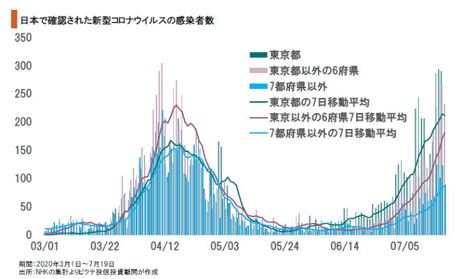 日本国内では、東京都を中心に感染が再拡大しつつある。病院、高齢者施設でクラスターが多発した第1波と異なり、今のところ20代、30代が中心のため、重症化による死者の急増には至っていない。ただし、新型インフルエンザ特措法に基づき、各都道府県知事が特定業種の企業、店舗への営業自粛要請を検討するなど、再び緊張感の高い状況に至っている。
