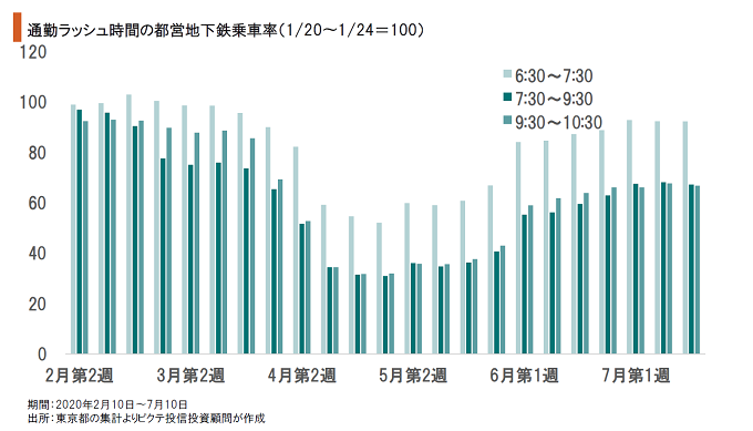 都営地下鉄の平日における朝の通勤・通学ラッシュ時の乗車率(7:30〜9:30)は、4月第4週に新型コロナウイルスが深刻化する前の31%まで落ち込んだ。緊急事態宣言の解除を受け、回復に転じたものの、依然として平時の68%程度に留まる。リモートワークや時差出勤など、新型コロナウイルスにより働き方が大きく変化したからだろう。