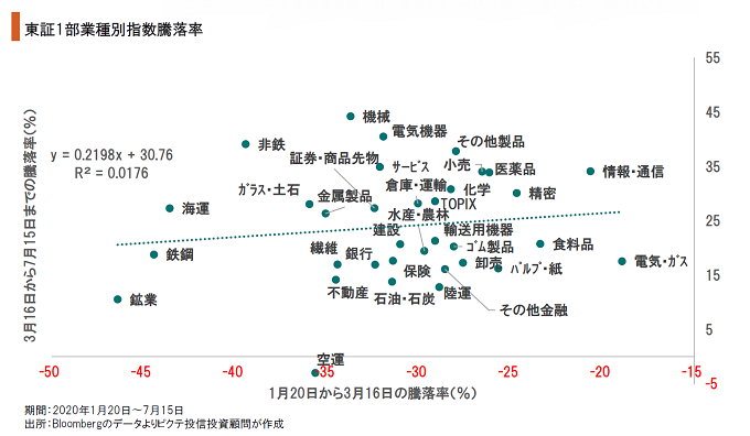 TOPIXの今年の高値である1月20日から安値の3月16日までの東証業種別指数の騰落率、そこから7月15日までの騰落率の関係を見ると、新型コロナウイルスの下でのマーケットでは、リターン・リバーサルが機能していない。むしろ、ボラティリティの小さな医薬品、情報・通信、小売などが市場をアウトパフォームしていることが際立った特徴だ。