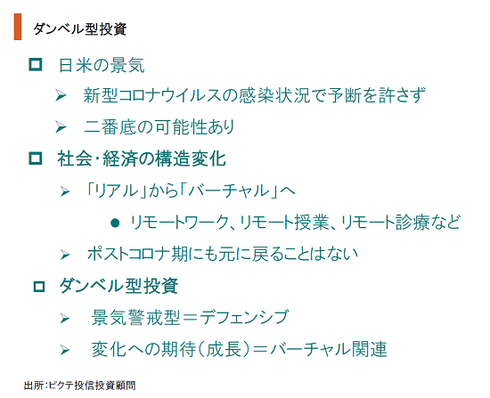新型コロナウイルスの感染拡大により、日米両国ともに景気の先行きは予断を許さない。米国の主要都市が再度のロックダウンに追い込まれた場合、心理面を含めた経済的な影響は大きいだろう。一方、企業の仕事のやり方は大きく変化し、リモート授業やリモート診療も活用が進む見込みだ。中央銀行の流動性供給もあり、そうしたリアルからバーチャルへの社会の転換をリードできる業種・企業の株式には資金が流入するのではないか。つまり、現在の市場環境では、成長セクターとしてのリモート関連、そしてディフェンシブに分散投資する「ダンベル型」アプローチが適切だろう。