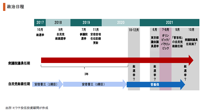 菅新政権が抱える当面の課題は、新型コロナウイルスの収束、経済の底上げだ。もっとも、衆議院の任期満了が1年後に迫るなか、政治的に見れば、解散・総選挙のタイミングが重要だろう。また、持続的に日本経済の成長力を高める上では、マクロ政策が注目される。菅首相は規制改革に意欲を示すが、雇用制度改革や産業の新陳代謝促進に舵を切るのか、日本株のパフォーマンスにも大きな影響を与えそうだ。