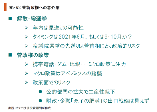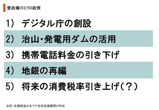 菅首相がこれまでに示した経済政策は、デジタル庁の創設、携帯電話料金の引き下げ、ダムの有効活用、地銀の再編などであり、マクロ政策はほとんど語られていない。総選挙もあるため、国民に分かり易く、実現可能な政策に絞っているのではないか。一方、マクロ政策については、財政・金融に大きく依存したアベノミクスを踏襲する見込みだ。