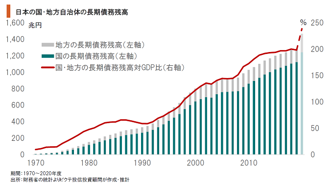 日本の財政状況は、世界の主要国で最も厳しい状況にあった。新型コロナ禍は、それを更に加速させている。国と地方を合わせた長期債務の残高が、2020年度に対名目GDP比で230%を超える可能性は否定できない。長期的に考えた場合、この公的債務の膨張は、通貨価値に影響するものと見られる。
