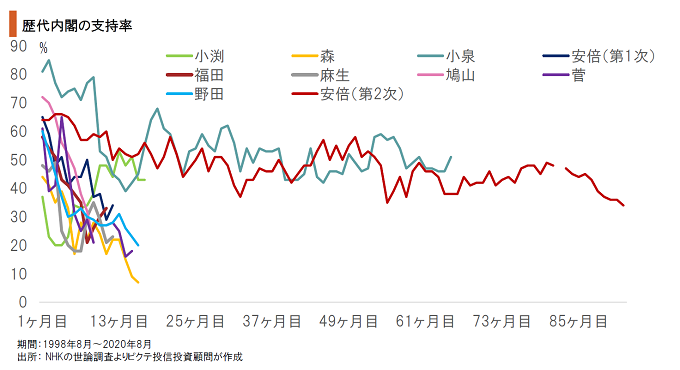 菅政権発足から3週間が経過した。当初、自民党内には、菅義偉首相が早期に国民に信を問うとの見方が強かったが、年内の解散は見送られる模様だ。同首相は、新政権としての実績を示す意向と言われている。過去の例から見ると、総選挙のタイミングは、来年6月の東京都議会議員選挙との同日選、もしくは東京オリンピック・パラリンピックが終わった秋となるのではないか。直近10代の内閣の支持率を見ると、発足時が最も高いケースが多く、8代において発足後1年以内に20%台へと低下していた。菅首相が総選挙を五輪前後とするならば、その時期の景気状況が非常に重要になるだろう。もっとも、菅首相の経済政策は携帯電話の料金引き下げ、ダムの有効活用などミクロ面が中心で、マクロ政策は財政・金融政策に依存した安倍前政権を踏襲する模様だ。その場合、景気は海外の状況に大きく左右されることに加え、1)公的部門の拡大で生産性が低下すること、2)将来の出口戦略の難易度がさらに高まりかねないこと・・・2つのリスクがある。また、雇用制度改革や産業の新陳代謝促進がなければ、日本株が世界をアウトパフォームすることは難しいのではないか。