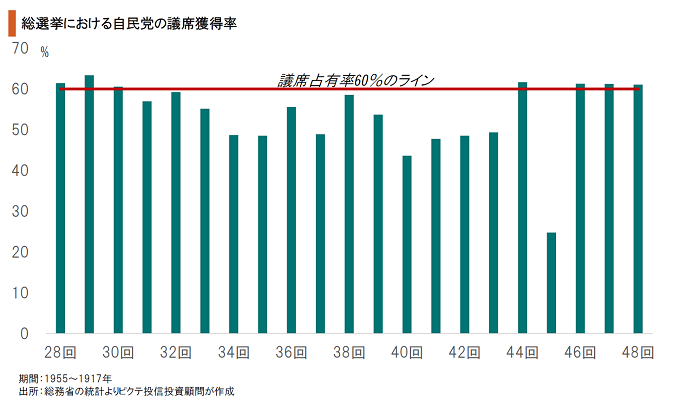 自民党結党以来21回の衆議院総選挙において、同党の議席獲得率が60%を超えたのは7回に留まる。安倍前総裁は、3回連続で60%を超えており、これは過去になかったことだ。それだけに、菅首相が長期政権を意識するとすれば、次の総選挙での60%の議席獲得は重要な意味を持つ。ただし、ハードルは非常に高いと言えるだろう。