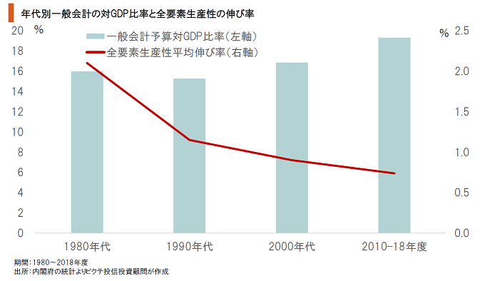 日本の一般会計対GDP比率は上昇基調にある。一方、全要素生産性(TFP)の年平均伸び率は、年代を追って低下してきた。公的部門による歳出は、一般的に生産性の低い部門へ向けられる可能性が強い。経済における公的部門のプレゼンスが大きくなると、生産性の伸びが落ち、潜在成長率は低下するだろう。
