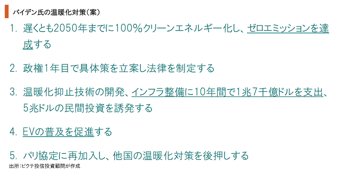 バイデン次期大統領は、選挙の公約として地球温暖化抑止を掲げ、現職のドナルド・トランプ大統領との違いを鮮明にした。従来、米国の政治家は産業界に影響の大きなゼロ・エミッションやEV普及に慎重な姿勢を示してきたが、バイデン氏はそれらの分野に大きく踏み込んだと言えそうだ。ポイントは、環境対策をコストではなく成長戦略と捉えることだろう。この点は、ボリス・ジョンソン英国首相、アンゲラ・メルケル独首相なども同様の考えを示している。