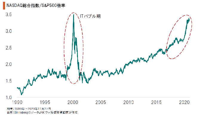 IT関連主導の相場は、社会の変化に加え、中央銀行による潤沢なマネーの供給が背景と言える。ゼロ金利が続くなか、リスク許容度が高まり、その一部が成長株へ向かったのではないか。新型コロナの収束へワクチンの接種が開始される見込みとなったが、景気回復には時間を要するだろう。金融緩和の継続により、成長株投資が続く可能性は高いと考えられる。