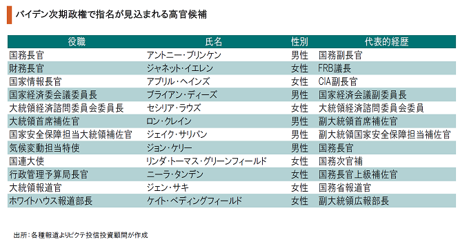 バイデン次期大統領は新政権の外交・安全保障、経済チームの主要メンバーを発表した。特に注目されるのは、ケリー元国務長官の気候変動担当特使だ。国際社会で名の通った大物政治家の起用は、今後の温暖化対策のルール設定について、米国が主導権を取る意図があるだろう。これは、トランプ大統領が背を向けた米国の伝統的外交姿勢に他ならない。
