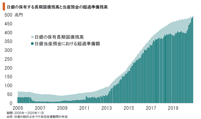 2013年4月4日、量的・質的緩和を採用して以降、日銀の保有する長期国債の残高は今年11月末までに406兆6,150億円増加した。一方、この間に民間金融機関が日銀の当座預金に積み上げた超過準備額は420兆5,632億円に達する。つまり、日銀が供給したマネタリーベースは、そのほとんどが超過準備として日銀にそのまま留まったと言えよう。