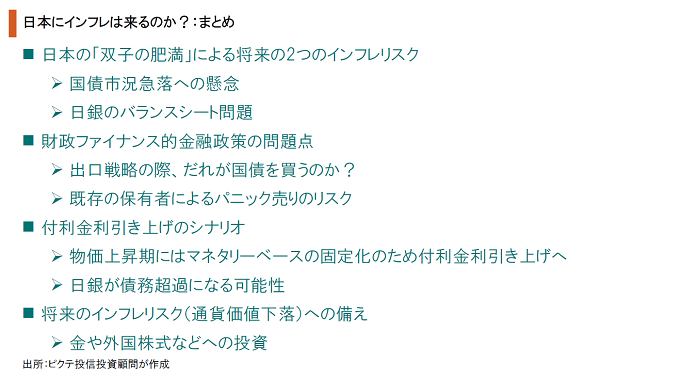 財政と金融の「双子の肥満」は、日本がデフレ状況にある間は問題が顕在化しないだろう。しかし、国際的に物価が上昇に転じ、日本のコアCPIが日銀の目標とする2%の上昇率に達した時、国債市況の不安定化、日銀のバランスシートの急速な悪化を通じて、円相場を急落させる可能性がある。それは、即ち通貨価値下落によるインフレだ。今後2~3年はそのリスクが小さいとしても、資産運用は5~10年先を視野に入れる必要がある。インフレに強い金や外国株式へ時間分散しつつ投資することにより、将来のインフレリスクをヘッジすべきではないか。