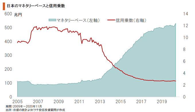 日銀の供給したマネタリーベースは銀行による与信の拡大に結び付かず、信用乗数が低下している。その結果、第2次安倍政権発足当初、デフレ脱却策の柱であった金融リフレ論は、財政リフレ論に主役の座を譲った。今後11ヶ月以内に総選挙が行われることもあり、菅政権においても、金融政策はファイナンス面で財政政策を支える役割を求められているようだ。