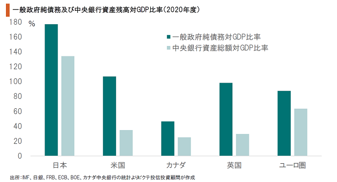 IMFによれば、日本の一般政府純債務対GDP比率は177.1%に達し、主要先進国では際立って高い。また、日銀の資産規模はGDPに対し134.0%であり、この数字も米欧主要国を大きく上回っている。新型コロナ禍で世界的に財政拡大と量的金融緩和策が実施されているが、財政・金融「双子の肥満」に関する日本の状況は突出していると言えるだろう。