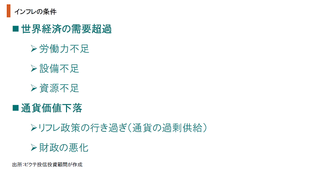 経済がインフレ状態に陥るには、大きく分けて2つの可能性がある。1つは実体経済における需給逼迫によるものであり、労働力や設備、資源の不足が要因と言えよう。もう1つは、マネーの過剰供給、財政の急激な悪化による通貨価値の下落だ。将来、日本経済が想定外のインフレに陥るリスクを想定する場合、実体経済における人、設備、資源の不足が起こり得るか、或いは通貨価値の下落が起こり得るか・・・これら2つの可能性の実現確率を考える必要がある。