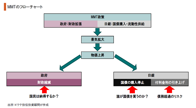 財政の拡大を中央銀行がファイナンスで支える手法はMMTに近い。課題は、想定通りに景気が拡大して物価が上昇した場合だ。財政の緊縮、増税は政治的に容易ではないだろう。他方、日銀は出口戦略に転じ、量的緩和を停止しなければならない。その時、国債の買い手がいなくなる結果、投機筋による空売りを含め、国債市況は大荒れの展開になる可能性がある。