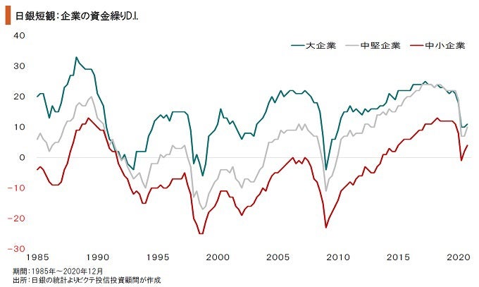 12月実施の日銀短観によれば、企業の資金繰り判断D.I.は、4-6月を底に上昇に転じている。新型コロナが深刻化した当初、売上高の急減に直面する企業は少なくなく、キャッシュ不足を招いていたと見られる。しかし、経済活動の再開に加え、政府・日銀に後押しされた民間金融機関の積極的な融資姿勢により、中小企業を含めて落ち着きを取り戻しつつあるのだろう。