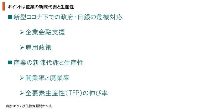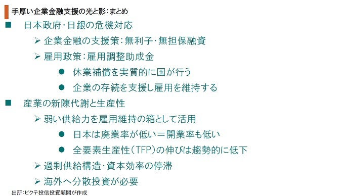 世界経済が新型コロナの影響を受けるなか、各国政府・中央銀行の対応は、足下の景気動向だけでなく、中長期的な潜在成長率に影響を及ぼす可能性がある。日本の場合、政府・日銀は無利子・無担保の企業金融支援策や雇用調整助成金により、企業の存続と雇用の維持を図ってきた。こうした施策が、産業の新陳代謝や生産性にどのような影響を及ぼすか、中長期投資の観点に立った場合、極めて重要な判断項目になるのではないか。