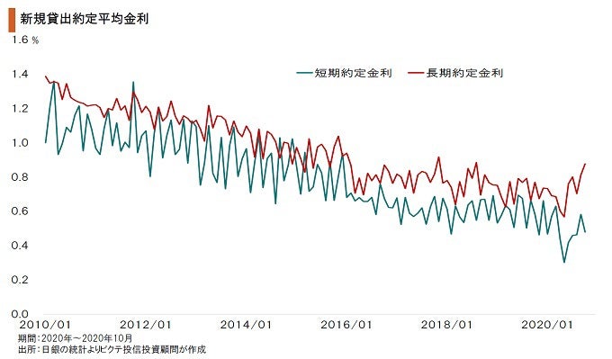 新規貸出約定平均金利は、5月、短期が0.301%、長期も0.567%まで低下した。3月末は短期0.630%、長期0.686%であり、2020年度第1次、第2次補正予算で導入された「新型コロナウイルス感染症特別貸付」などによる貸出金利の低下が確認できる。6月以降、長期の金利が上昇しているのは、低金利下で超長期の借り入れが急増したことが背景ではないか。