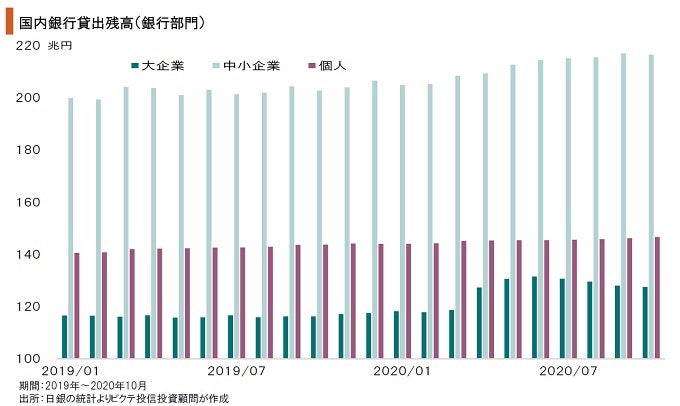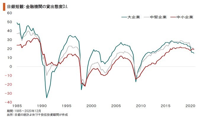 12月実施の日銀短観によれば、金融機関の貸出態度D.I.は、企業規模を問わず前回から1ポイント低下した。ただし、水準は依然高く、新型コロナ禍の下でも金融機関は貸し渋りや貸し剥がしを行っていないことが推測される。その背景にあるのは、2013年以降の量的・質的緩和に加え、新型コロナ対策として政府・日銀が実施した企業金融支援策だろう。