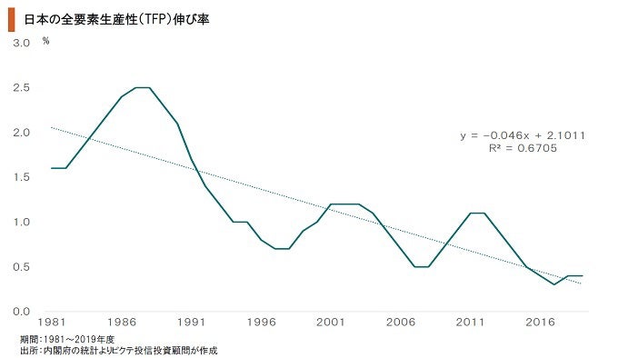 第2次安倍政権下の2013~19年度、日本の全要素生産性(TFP)の伸び率は年平均0.5%に留まった。産業の新陳代謝が進まず、生産性の低下に歯止めが掛けられなかった結果と言える。その背景には、企業の存続を重視し、失業率を低位安定させる政策があるだろう。構造的な生産性の伸び鈍化は、日本の潜在成長率を逓減させる要因に他ならない。