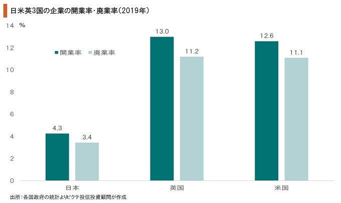 新型コロナ禍を受け、世界的に政府・中央銀行による歴史的な経済対策が打たれている。日本も例外ではなく、安倍晋三前内閣、菅義偉現内閣は特に企業金融支援、雇用維持対策に注力してきた。その結果、日本の失業率は低位に維持されており、概ね社会の安定も保たれた状況だ。一方、構造的に見ると、日本経済における産業の新陳代謝は必ずしも進んでいない。例えば、企業の廃業率は米英両国の場合は好況期でも10%を超えているのに対し、日本は概ね5%以下の推移を続けている。危機下において政府・日銀が企業の金融支援を手厚く行い、雇用調整助成金などにより企業の存続と雇用の維持を図ってきたことが一因だろう。こうした施策は社会の安定には寄与した。他方、先進国の場合、廃業率は開業率と正の相関関係にあり、低い廃業率は新たな成長産業が生まれ難いことを意味する。産業の新陳代謝の遅れは、日本経済の生産性の伸びを長期的に停滞させてきた。人口減少と高齢化の下、財政と金融の「双子の肥満」、そして過剰供給と生産性低下は、国内資産への投資リターンを抑える要因と言え、中長期的な国際分散投資の必要性を示唆しているのではないか。