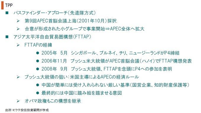 中国の脅威は、将来、同国が「世界の工場」から「世界最大の消費市場」へ構造転換し、世界中から財貨を購入して国際的な発言力を強化することだろう。ブッシュ、オバマ両大統領はTPPを推進し、APEC全体の経済ルールとすることで、中国に経済改革を迫ろうとした。しかし、トランプ大統領は就任日にTPP交渉から離脱、米国は対中戦略の軸を失ったのである。