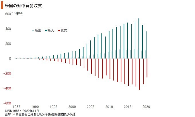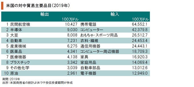 2018年、米国の対中貿易赤字は4.190億ドルに達して過去最大になった。これは、同年における米国の貿易赤字の48.0%を占めている。特に2012年に259億ドルに達していた米国の対中農産物輸出は、2018年に91億ドルへと落ち込んでいた。米国の農村地帯は共和党の厚い支持層だけに、トランプ政権にとっては頭の痛い状況だったと言えるだろう。