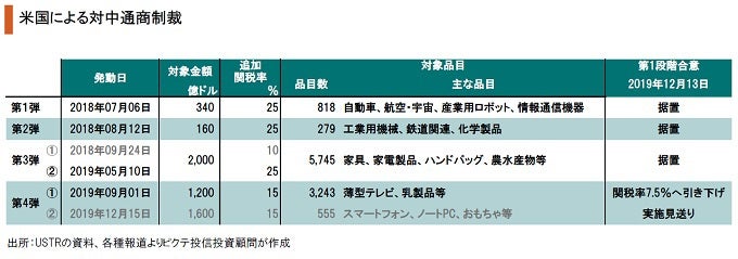 トランプ大統領は、2018年7月6日に対中通商制裁第1弾を発動、その後も矢継ぎ早に制裁措置を実施した。2016年の大統領選挙で対中不均衡是正を訴えた同大統領は、自らの再選を賭けた2020年の選挙前に成果を挙げる必要があったと考えられる。結局、2019年12月13日、米中両国はお互いに譲歩するかたちで第1弾の貿易協定で合意した。